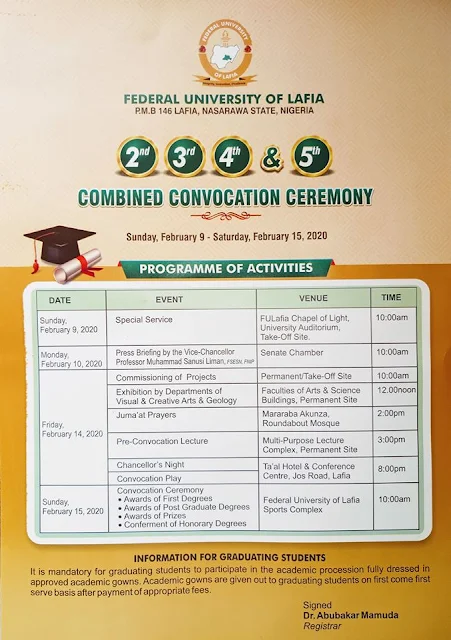 The Vice Chancellor of Federal University of Lafia (FULAFIA) on behalf of the, Management, Senate, Faculty, Staff and Students cordially invites members of the general public to the 2nd, 3rd, 4th and 5th Combined Convocation Ceremony for the award of First and Higher Degrees and Presentation of Prizes scheduled to hold as follows:Dates: 9th - 15th February, 2020.
