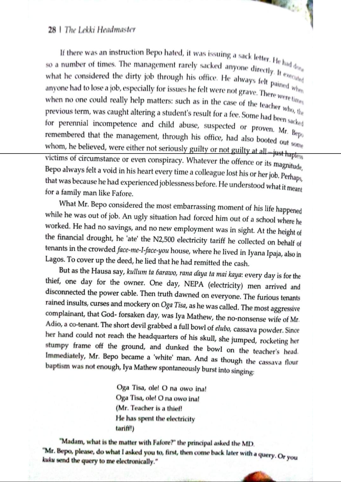 He recalls several other incidents where teachers were sacked. Some who were sacked were guilty and others were just “victims of circumstance or even conspiracy.” He always felt bad whenever he had to write a sack letter. He understands what can drive people to do things like this. He recalls an incident a long time ago when he was out of a job and had no savings. He ‘ate’ the N2,500 electricity tariff he had collected on behalf of the tenants and lied that he had paid it. However, the truth came out when the NEPA officials cut them off. The tenants mocked the “Oga Tisa” and disgraced him in front of everyone.